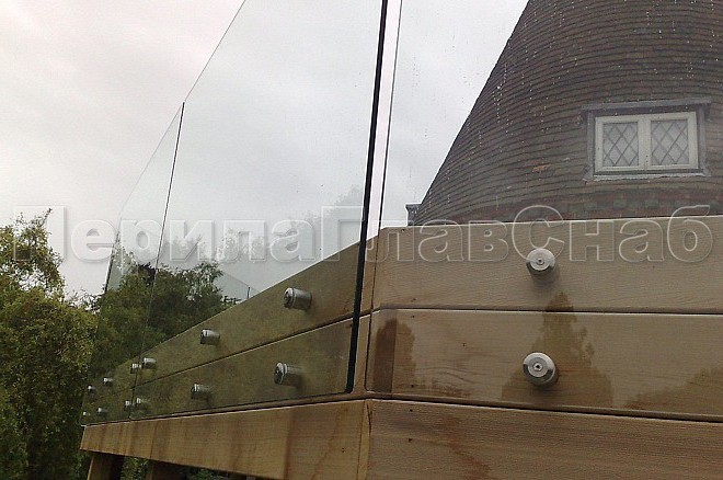 Ограждение с деревянным поручнем с зажимными стеклодержателями и стойками