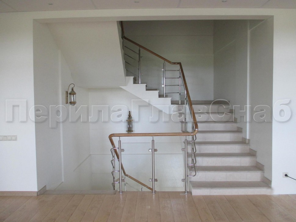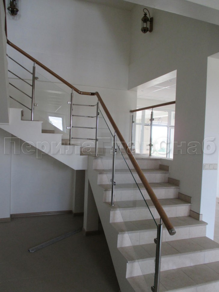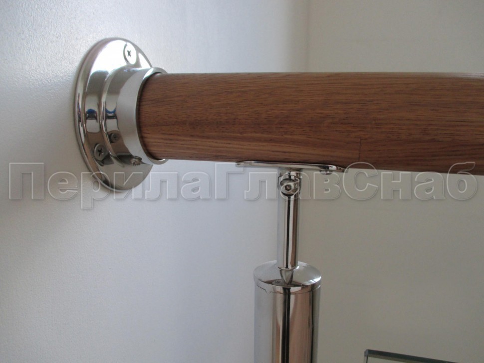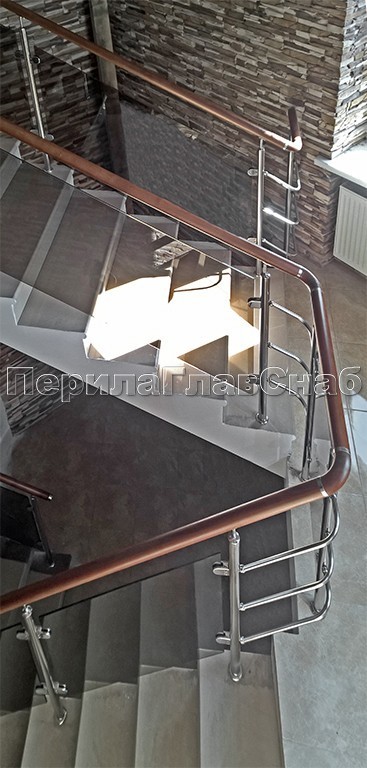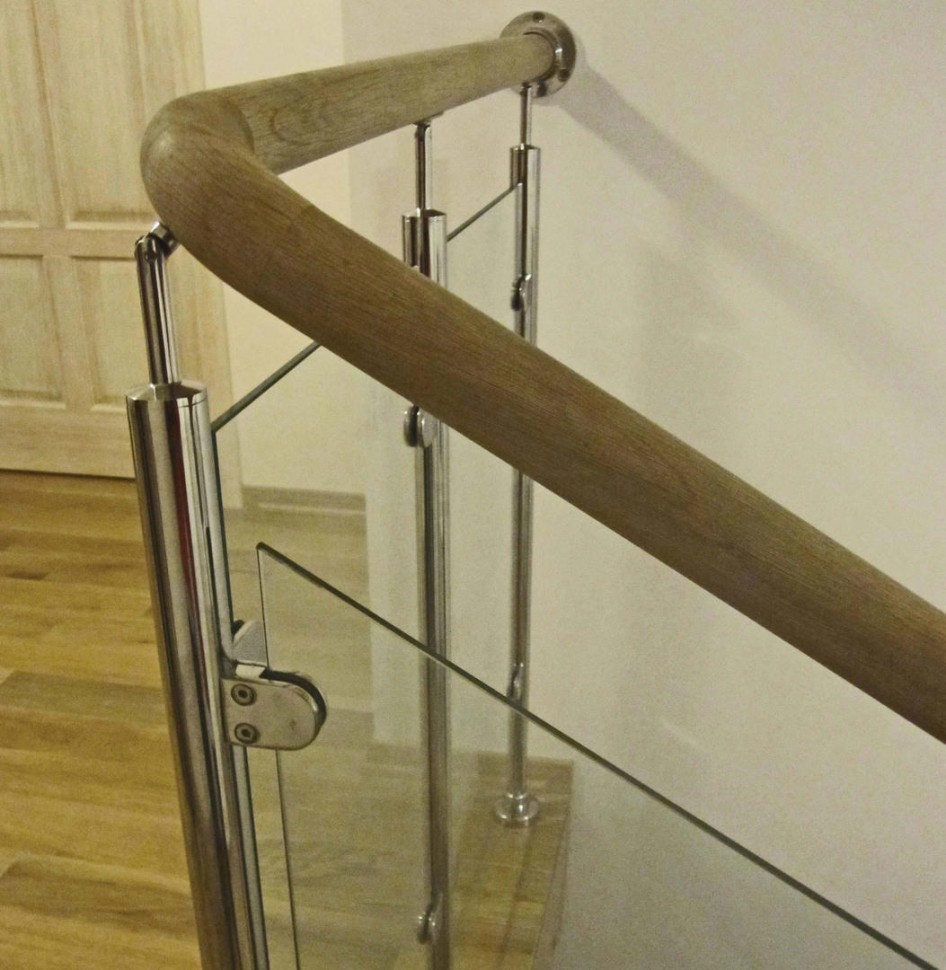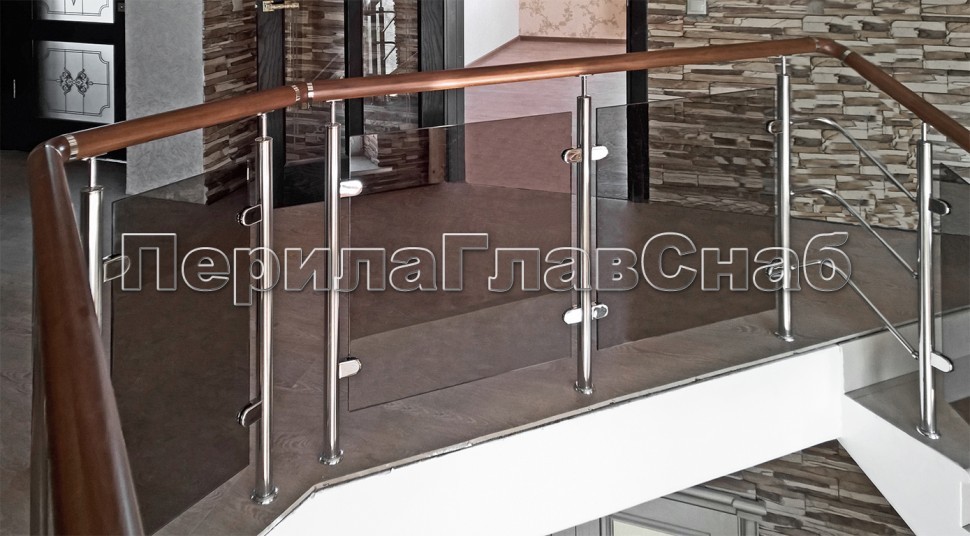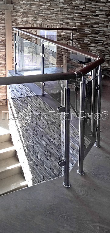 Ограждение с круглым деревянным поручнем с зажимными стеклодержателями и стойками с деревянными вставками