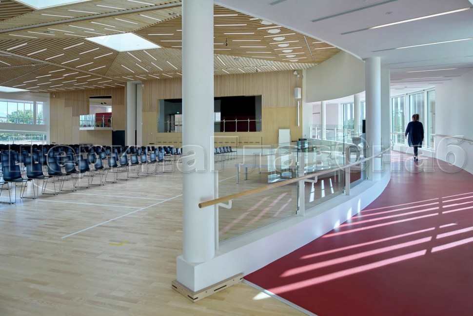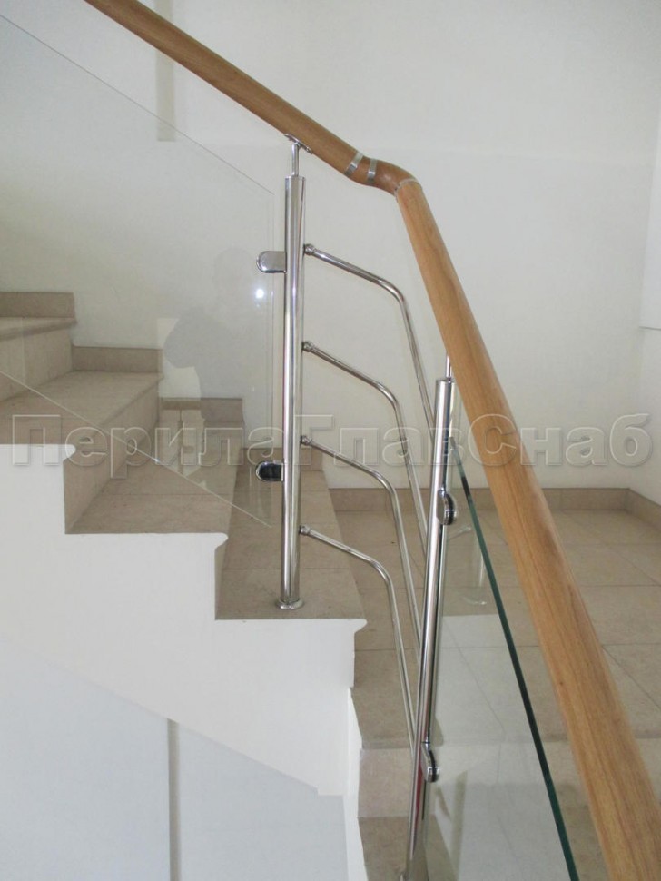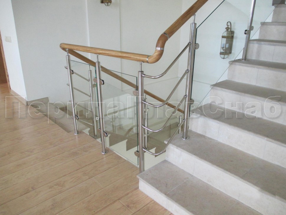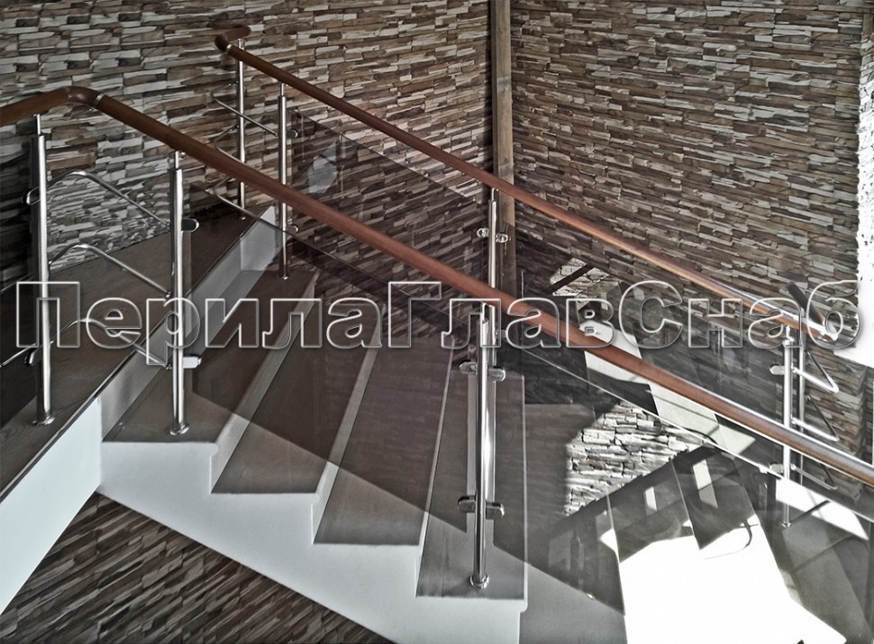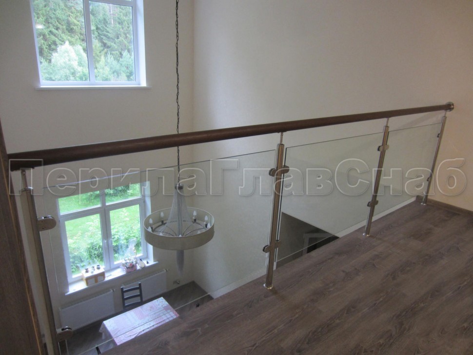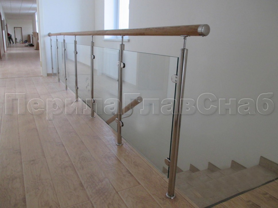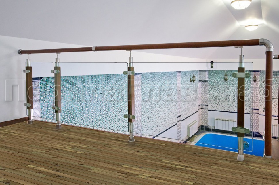 Ограждение с деревянным поручнем с зажимными стеклодержателями и стойками